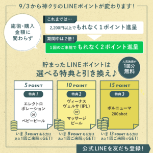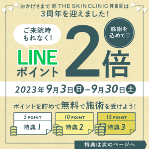 2023年9月3日(日)をもちまして、THE SKIN CLINIC神楽坂は【創業3周年】を迎えます🎉いつも当院をご愛顧いただき、誠にありがとうございます🙇♀️皆さまへ日頃の感謝を込めて…—————創業3周年記念『LINEポイント2倍』企画📢—————神クリ公式LINEのショップカードでご来院時にもれなく2ポイント進呈🎁ポイントを貯めると、特典として無料で施術を受けられるチャンス✨是非ともポイントを貯めて、神クリの施術をご体験ください👩⚕️